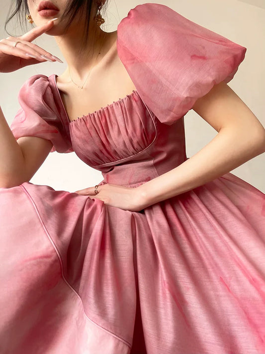 Aconiconi Elegant Oil Painting Square Collar Ruffle cocktail Dress- Floating Light Painting Summer