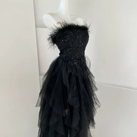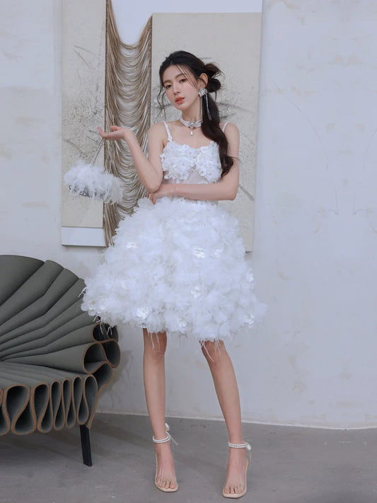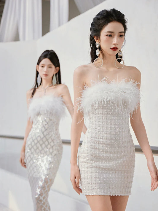 DOLLY Elegant White Feather Strapless Bandeau Birthday Dress- Julia