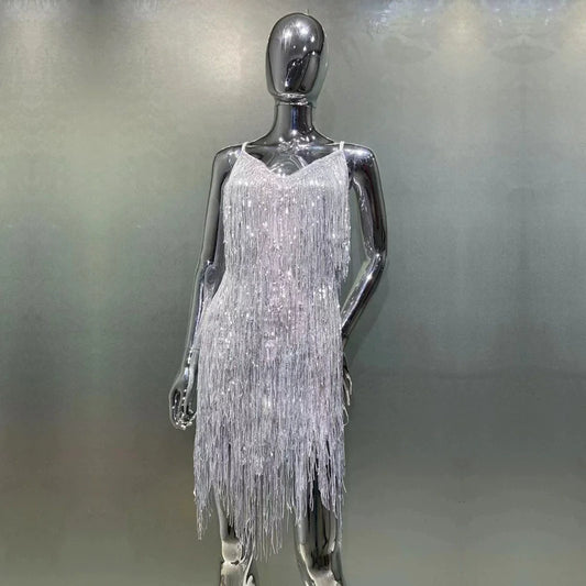 DOLLY Elegant Turquoise Green Sleeveless V-neck Tassel Glitter Cocktail Dress-ALEXA