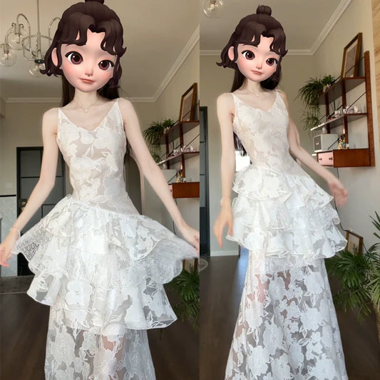 DOLLY Elegant White Flower Embroidery Lace Ruffle Layered Dinner Dress-DAISY (V)