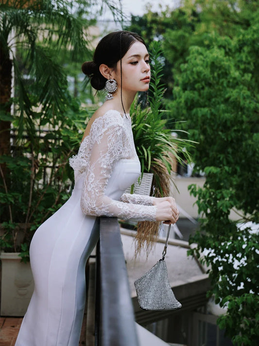 DOLLY Elegant White French Style Lace Long Sleeve Slim Fit Midi Wedding Dress-ZINA (V) *