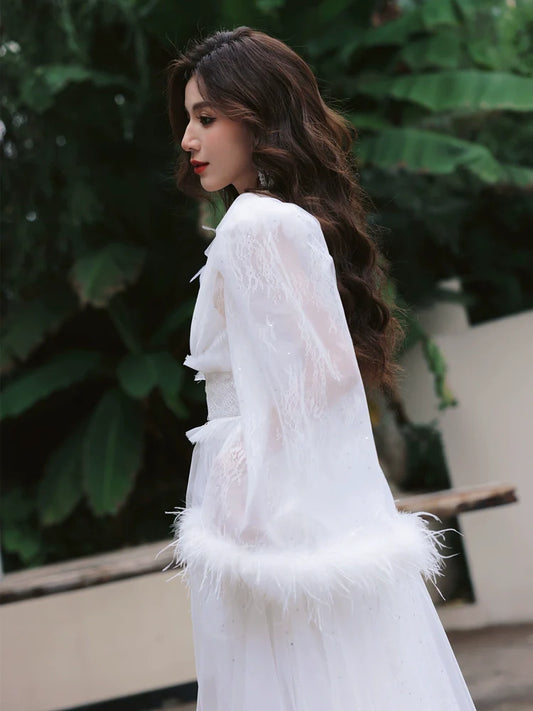 DOLLY Elegant White Deep V-Neck Lace Feather Bell Sleeves Long Robe Dress-ZOBA (V)*