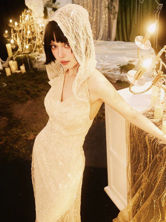 DOLLY High End Beige Ins Style V-Neck Sleeveless Long Lace Dinner Dress-BEVA
