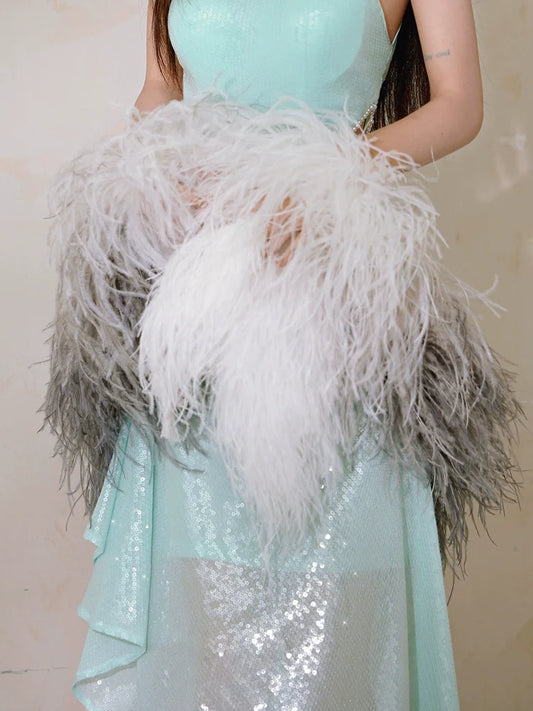 DOLLY High End Gray and White Russian Style High Grade Fluffy Feather Shawl-BENI