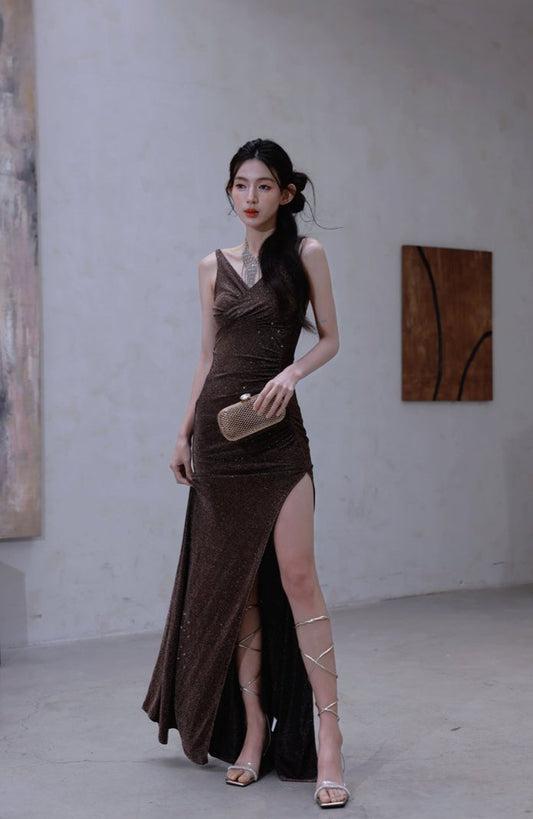 DOLLY Luxury Coffee Brown Sequin Sleeveless Long Slit Banquet Dress-Rola