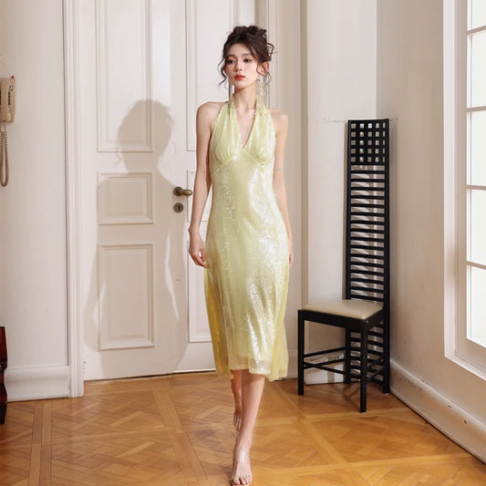 DOLLY Luxury Lemon Yellow Sequin Halter Neck Backless Short Birthday Dress-NELLIE