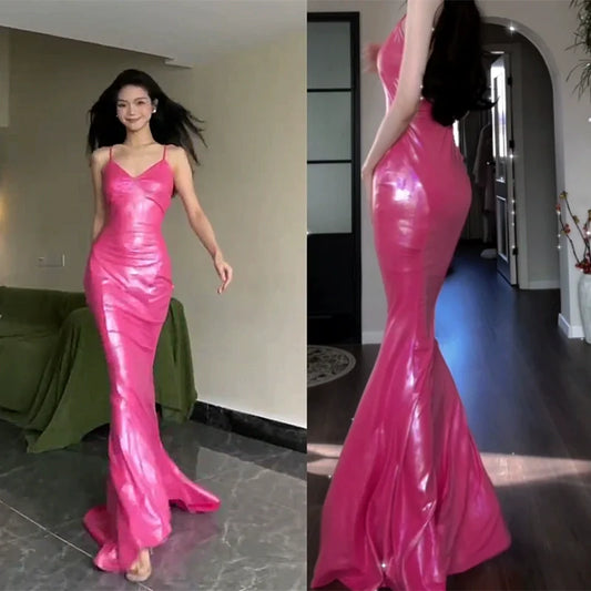 DOLLY Luxury Electric Pink Sleeveless Backless Body Hug Long Birthday Dress-SELA