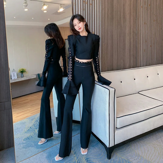 DOLLY Luxury Long Trumpet Sleeve Crop Top+ High Waist Long Flared Pants-LOLA