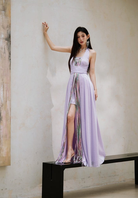 DOLLY Luxury Purple Halter Neck Backless Tassel Sexy Long Party Dress-Babe