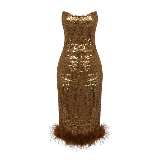 DOLLY Luxury Sleeveless Sequin strapless Feather Fish Tail Midi Cocktail Dress-BROOKE