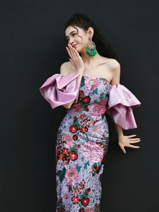 DOLLY Luxury Retro Purple Floral Embroidered Tube Top Long Sequin Party Dress-JOY