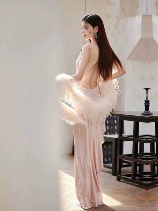 DOLLY Luxury Peach Pink Feather Tube Top Long Dinner Date Dress-VERO