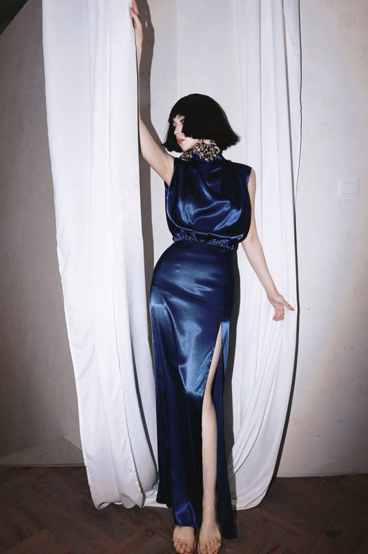 DOLLY Luxury Navy Blue Mock Neck Sleeveless Satin Long Slit Cocktail Dress-PRIYA
