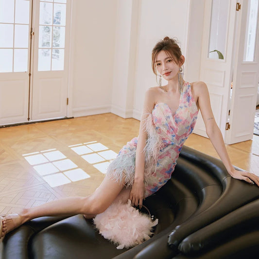 DOLLY Luxury Multi Colored V-Neck Sleeveless Feather Sequin Short Party Dress-FRANKIE
