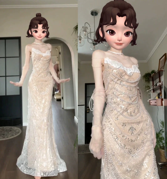 DOLLY Luxury Off White Retro Beaded Tube Top Sequin Long Wedding Dress-MARKU