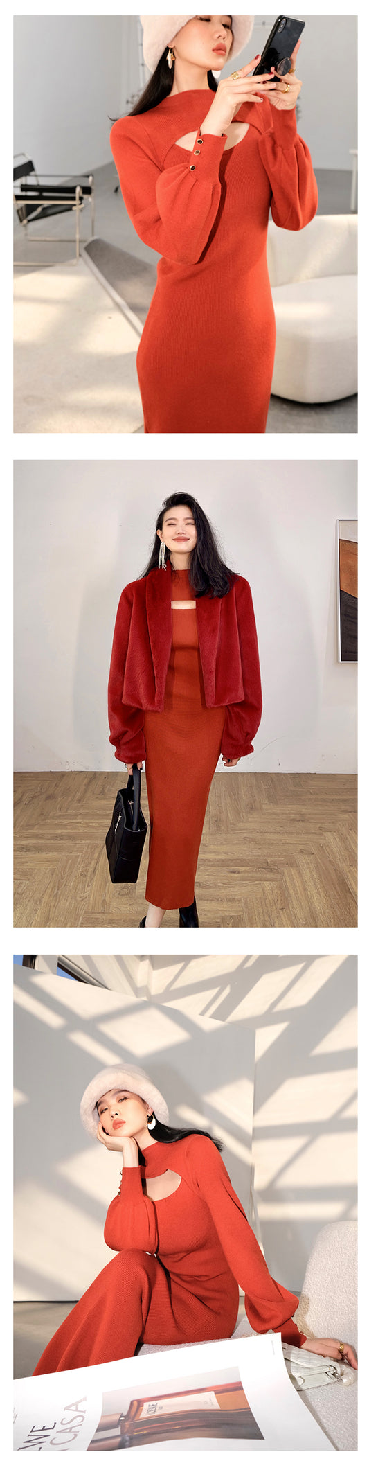 Hollow Lantern Sleeves Half Turtleneck midi knit sweater dress - keeasa red