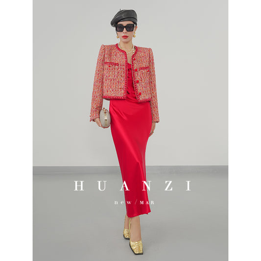 Huanzi custom 2022 autumn and winter new high-definition handmade red tweed temperament lady style small fragrant wind jacket female