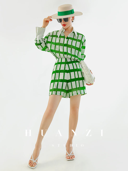 Huanzi jacquard plaid brushed green high waist short shirt - Guk