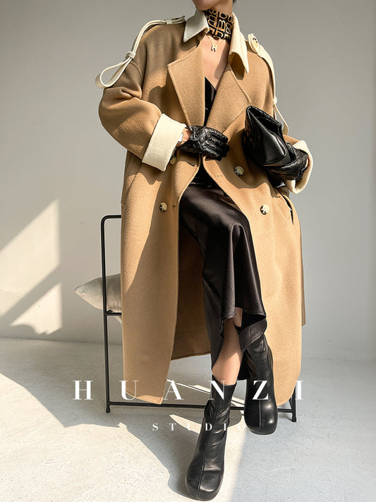 Huanzi high-grade contrasting color double-sided cashmere woolen coat new autumn and winter waist waist long- Trina