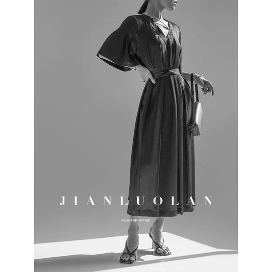Huanzi high-end satin black V-neck slim pleated dress - Nigoi