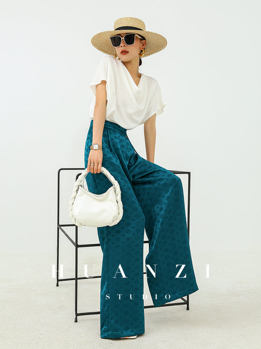 Huanzi luxury high-end silky drape blue high-waisted wide-leg pants - Anna