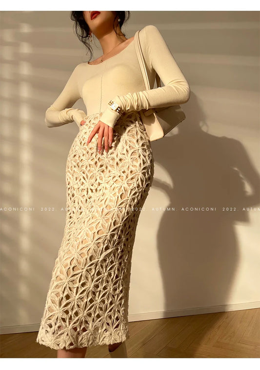 Aconiconi Elegant French Retro Hollow lace High Waist Midi pencil lace Skirt - Tina