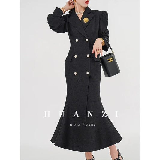Huanzi vintage retro fishtail timeless classic long coat jacket - Micewo