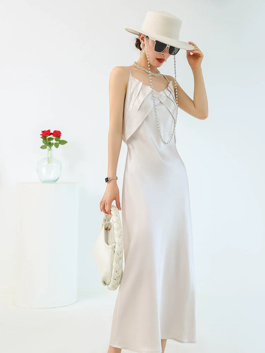Huanzi high-end satin black V-neck slim pleated dress - Nigoi