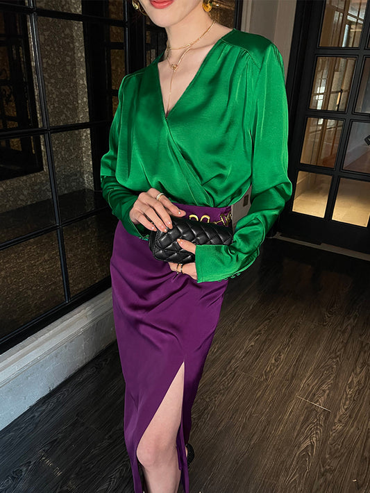 Retro jewel green V-neck shirt top + pencil slit pleated purple skirt suit set - Natu