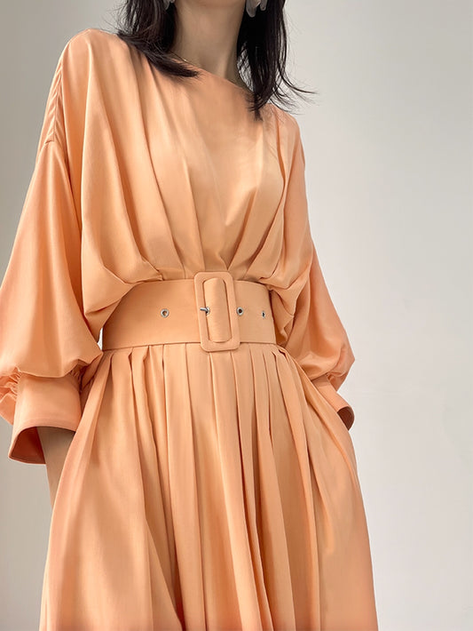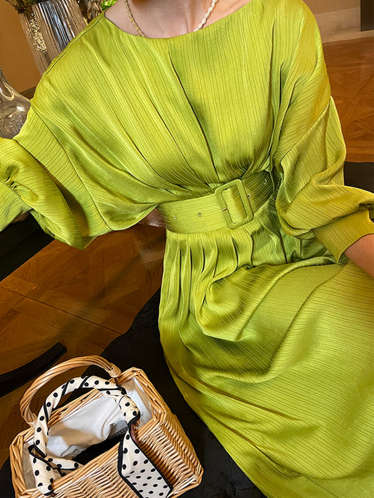 French romantic light luxury satin pleated waist lantern bat sleeve midi tea dre - Aplss