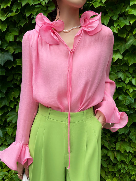 Sweet powder summer lotus leaf collar loose trumpet sleeve fairy V-neck light shirt top - Tiki