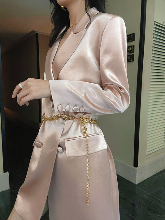 lapel spring pink high-end satin double-breasted suit blazer dress - Jaui
