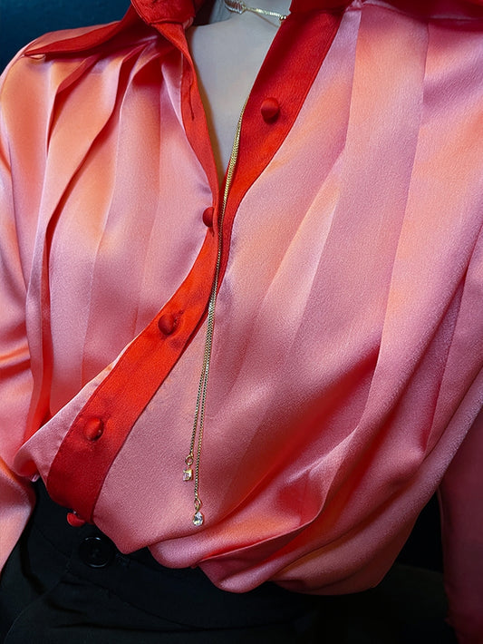 High-quality watermelon red color-block double sleeves pleated satin shirt top - Traue