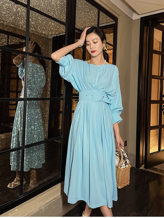 Summer ice blue pleated waist lantern bat sleeve elegant dress - Vios