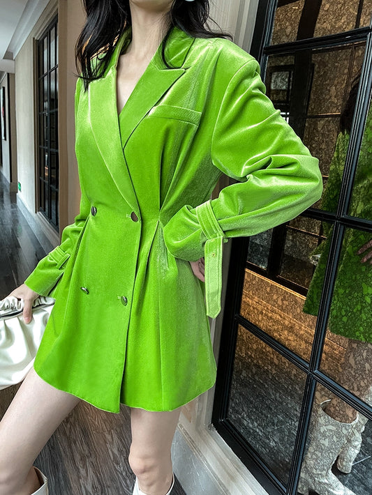 high-end bright green velvet suit waist pleate jacket dress - Doeai
