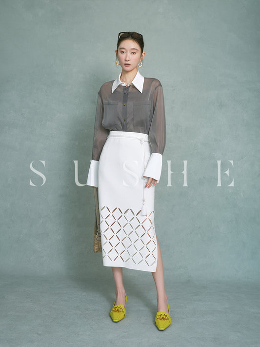 High end coconut cream white cut out knitted pencil Spring white skirt - Lalu
