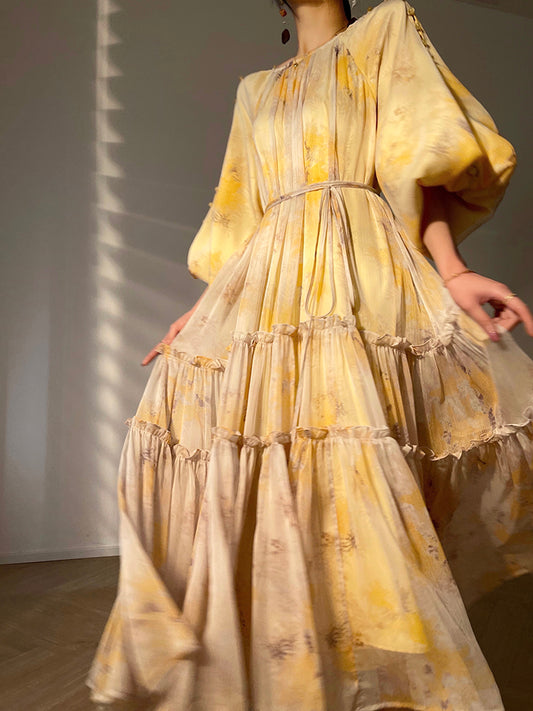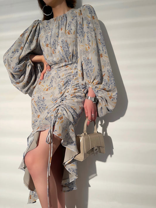 Aconiconi|high-end French tea floral printed elegant lantern sleeve midi dress - Nila