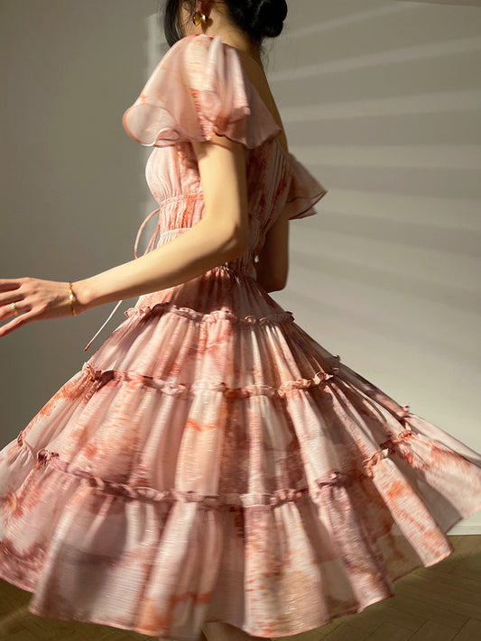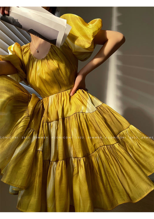 Aconiconi|SunsetLight Luxury Heavy Premium French Ink Print Swing Dress -pomelo