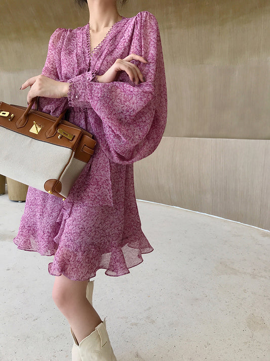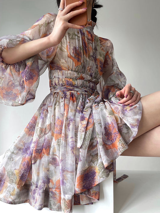 Aconiconi|French style elegant printed floral chiffon summer dress - Nikol