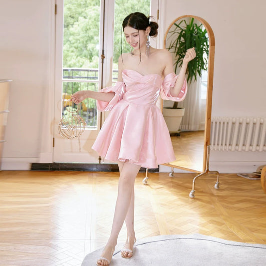 DOLLY High End Pink Off Shoulder Short Sleeve Chest Wrap Tutu Chic Dress-GARTEL