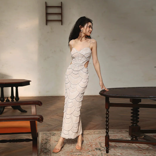 DOLLY High End Off White Sleeveless Beaded Hollow Waist Sexy Party Dress-KATHY