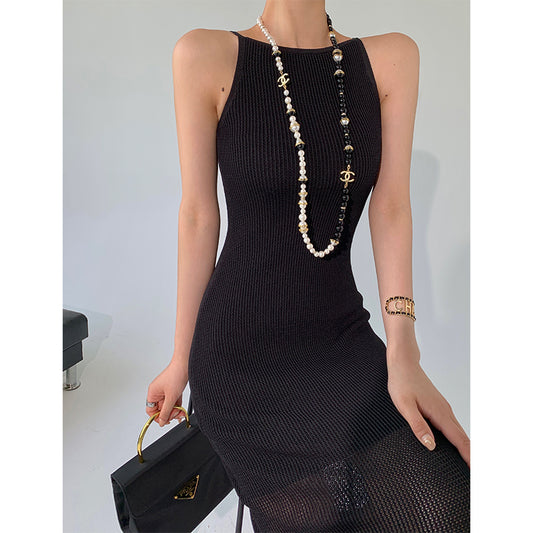 WANXO black one-shoulder suspender dress women's summer new 2022 sexy hollow knitted mid-length skirt