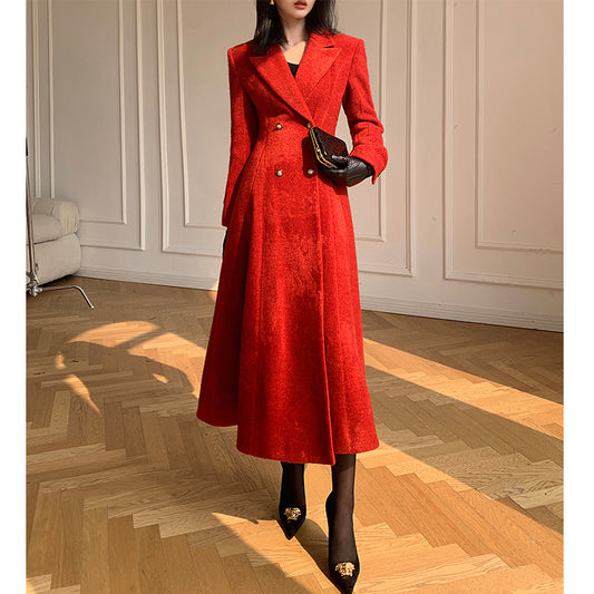WANXO French red Hepburn style woolen coat new waist and thin long woolen coat- Crissy