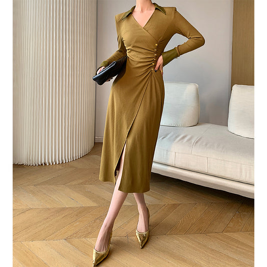 WANXO green v-neck shirt dress new waist and thin knitted slit bottoming skirt- Bella