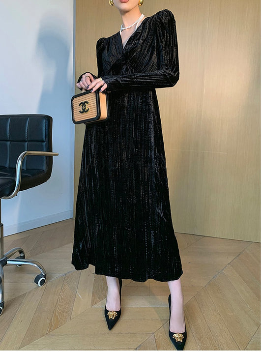 WANXO French black V-neck velvet dress new waist and slim mid-length skirt- Gulia