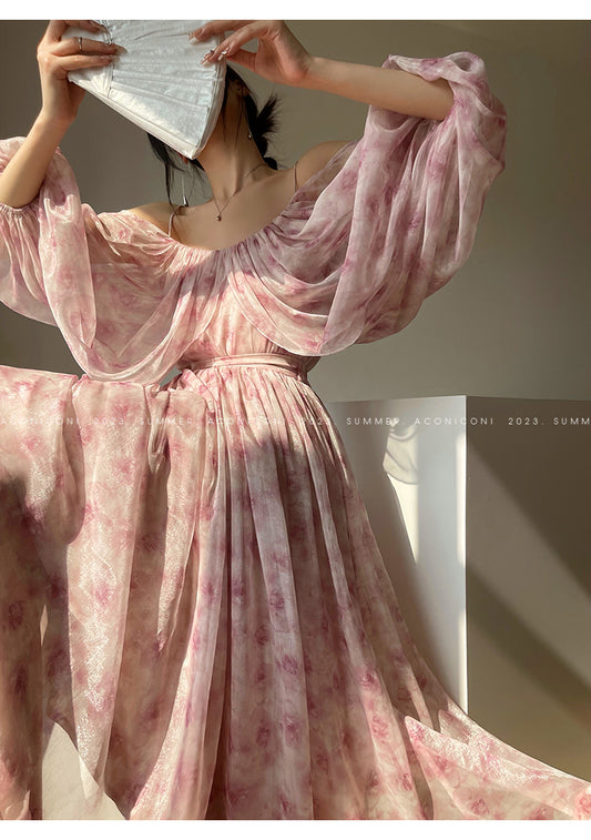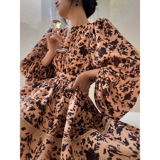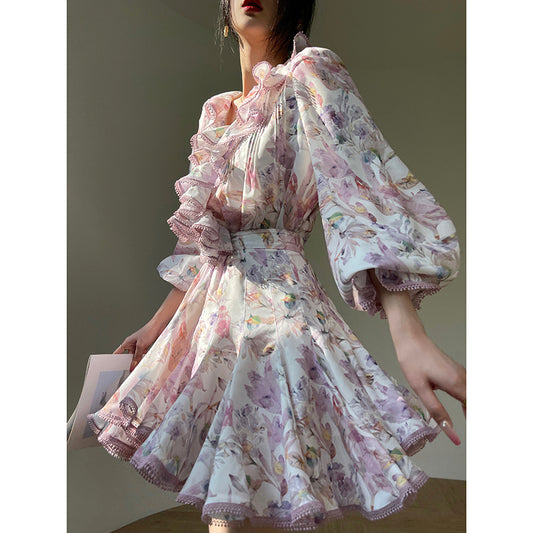 Aconiconi| French print high-end balloon sleeve top dress - Lin Yingyu