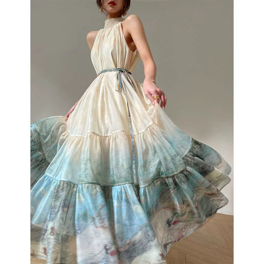 Aconiconi| Louvre Picture Reflection printed halter neck maxi skirt vacation dress - Miinia