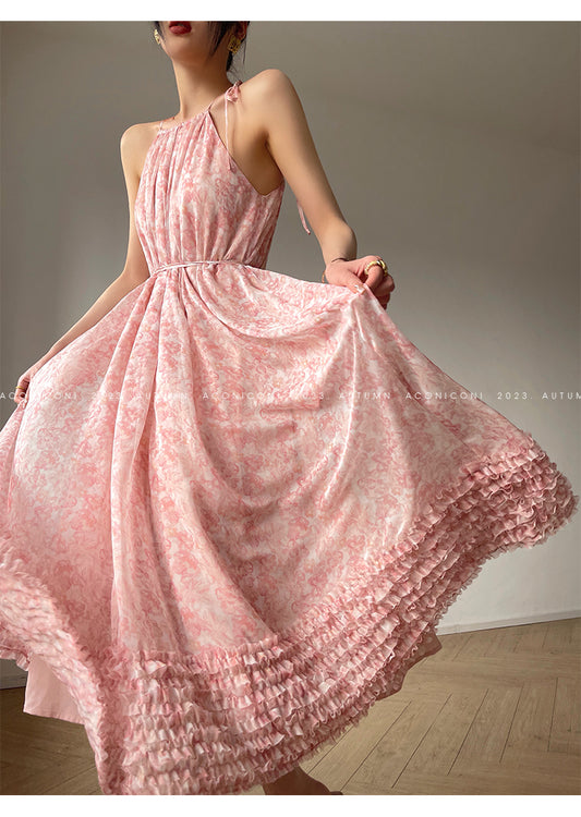 Aconiconi| halter-neck summer broken flowers vacation holiday style fairy dress - cherry blossom