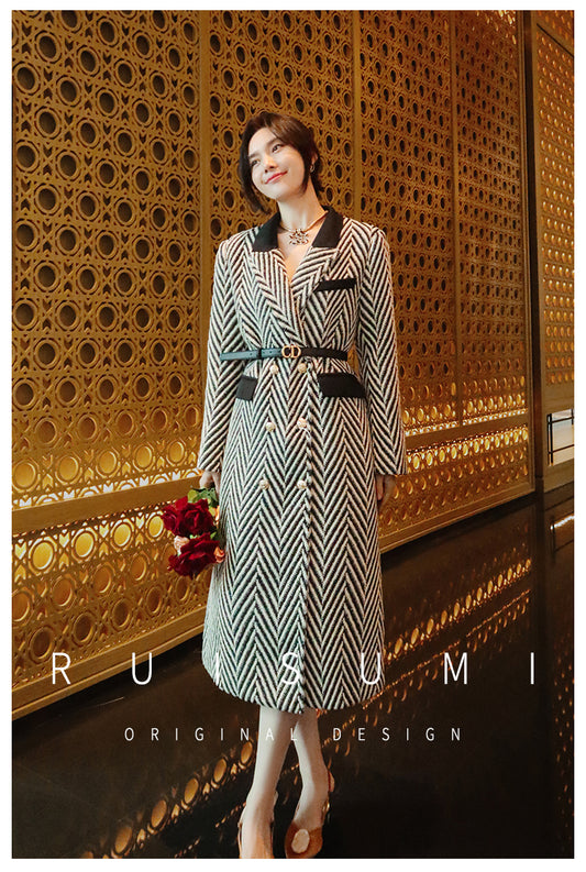 Design sense niche high-end black and white herringbone stitching classic suit collar long coat- Duli