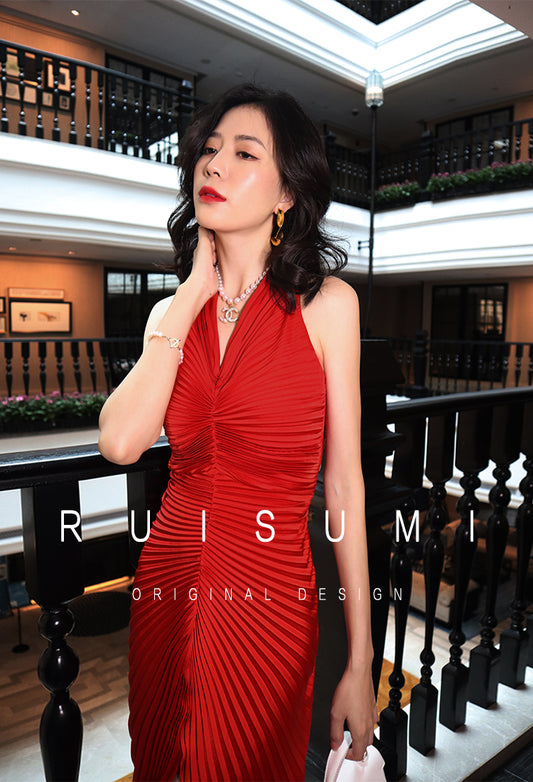 Retro wine red V-neck pleated slit dress red velvet annual meeting dress skirt- Rose